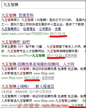 有的站长在网站刚刚成立,为了马上见到效果,不惜一切代价,购买大量链接,一个站有的一天加了几十个外链,这样很容易被百度给K的,站是一天一天做起来的,心急吃不了热豆腐,只有慢慢向搜索引擎提交东西,才能由低走向高。下图是九五智聘,在刚成立的时候,向搜索引擎提交的东西: