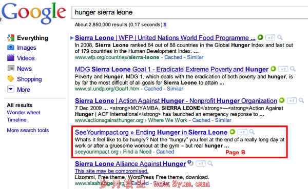原图中范例所使用的关键字并不恰当,所以我实际使用"hunger sierra leone"在Google.com中搜寻,发现依旧是Page B获得了比较好的名次。