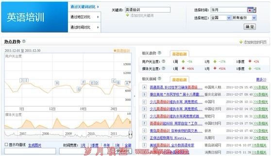 百度指数和谷歌指数我们可以活用这些工具了解现在关键词的,如我可以通过百度指数工具了解到“英语培训”这个关键词在这段时间的一个数据如下图: