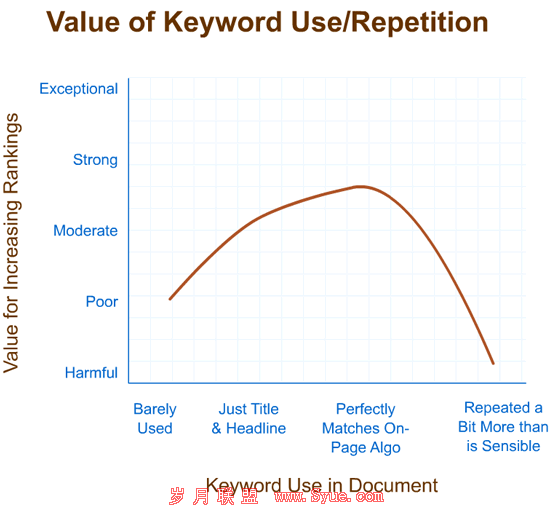 可以看到的是,关键词只要出现了就有一定效果,在一定范围内出现频率越高,效果越好。但超出这个范围以后,对排名的效果会以更快的速度回落。