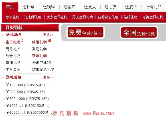 这是一个卖礼品的网站,我们可以构思一下,买礼品的人进入这个网站,导航会指引他如何选择礼品(送什么人?——因什么事情而送?)。这样可以无形地引导了客户消费,我们要做的是把导航变成一个导购员。