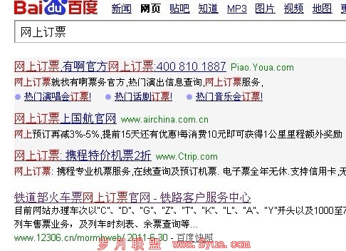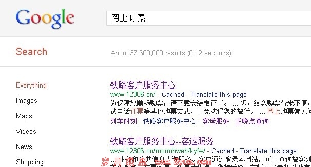 2.点击次数影响排名。自铁道部网上订票系统上线后,大多数还没有熟悉网址的用户就在百度里面搜索网上订票等关键词,然后找到铁道部。也就是在短短的一个月时间内,搜索“网上订票”铁道部网站排名第一,不管是在百度还是在谷歌搜索下(见下图),不管网站有没有关键词和标题等等。同行的也都知道,一个词的大量搜索和网站的相关点击会极大的影响网站的排名。这也是搜索引擎的算法之一。