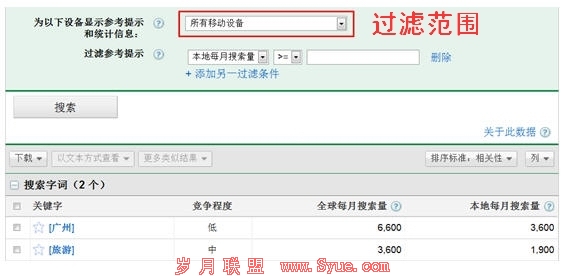 因为移动该设备屏幕和输入键盘的局限性,移动设备的搜索用户的搜索的关键词相比于桌面用户来说会更加的简短。对此我们可以使用一些相应的工具来进行移动搜索关键词的研究,如谷歌的Adword关键词查询工具进行查询。如下图所示,我们可以使用过滤选项来查找属于移动设备的关键词。