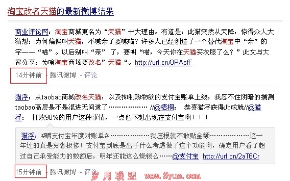 淘宝改名事件再次给许多做腾讯微博、搜狐微博的朋友机会,很多人都在关注这事件,给他们带来引流的机会,一般做腾讯和搜狐微博,发一条微博相关信息,就能爬到第二名,第三名那样,流量非常大,也是一个机遇。