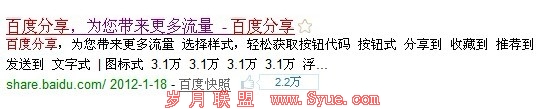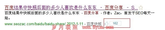 百度分享一时间被很多seoer追捧,尤其是seo界内的前辈zac老师在《百度结果中快照后面的多少人喜欢是什么东东 – 百度分享 》文中让更多的seo优化人员把代码添加进入网站里,从而在百度收录页面上出现这个“数字小框”是否对排名有好处,让很多seo开始研究讨论了。笔者认为这个小框就像工具上百度流量一样,只是一个统计个大概数值而已,不能作为一个真正的认定数据来操作,下面会那出一些推理让大家讨论分享,但是笔者认为这个百度分享在企业用户体验上会增加一定的信任度。