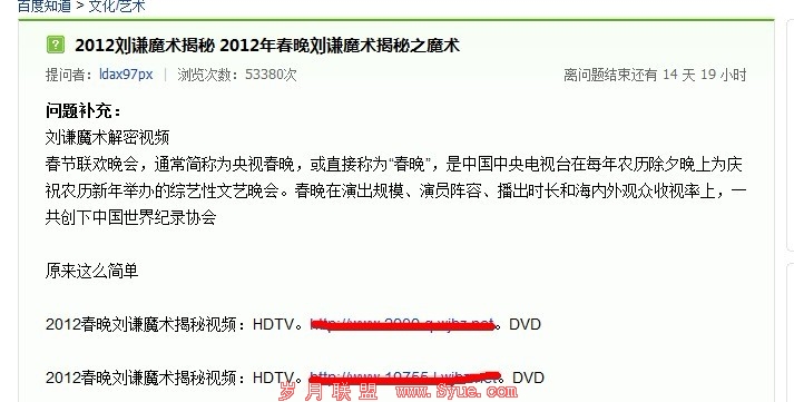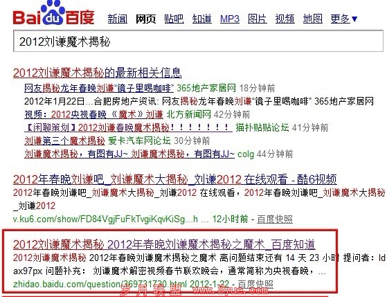 当刘谦再次与董卿合作,董卿再次成为刘谦的托的时候,这个节目的关注度无疑是最高的,既然是刘谦,既然是魔术,那么揭秘肯定是所有网民最喜爱的事情,笔者也是所有充满好奇心的网友中的一员,笔者搜索“2012刘谦魔术揭秘”,出现了一个百度知道排第二名,