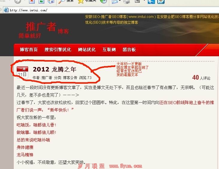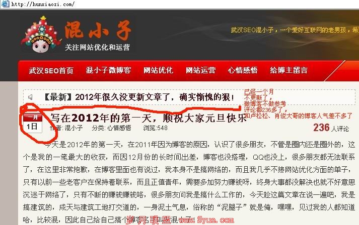 春节也过完了,可能是博主实在太忙了,无法更新博客,前段时间被降权带www的,所以才301定向到不带www,排名还是很不错,不更新内容,博文都有几百评论了,都赶得上名博了,卢松松的人气很高,评论也是几百以上,能做到这种地步,都是很不容易哈,博主的执行力太强悍了哦,这就是用户体验高所造成的网站不更新,排名还是存在的哦。