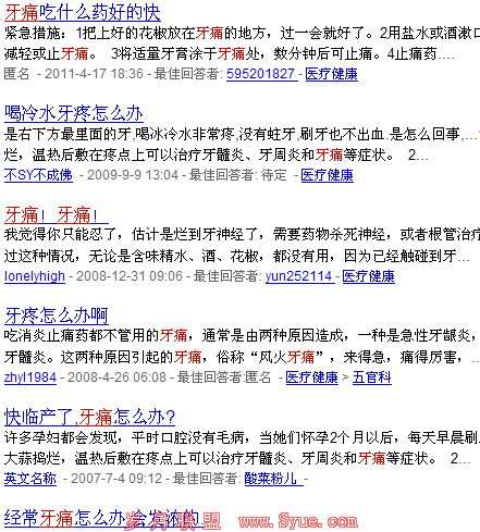 众所周知,百度知道是以长尾关键词的形式获取流量的,而且该网站属于问答类型的,自然内容的标题都是以长尾的形式出现的,比如牙痛这个关键词,一般的标题都会以牙痛怎么办、治牙痛的方法、牙痛怎么防治等等一系列的长尾形式的标题,如图: