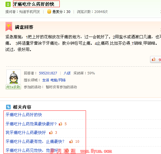 从问题上看,牙痛吃什么药好得快这个长尾关键词中,相关内容呈现了与之相关性比较强的其他长尾关键词,而这个区域就是咱们挖掘精准长尾关键词的目标所在。咱们要做的是把这些长尾关键词根据自身网站的情况做分析选择,如此一来精准性的长尾关键词不就手到擒来了吗?所以说,挖掘精准长尾关键词最好的方法就是通过查看百度知道的内容页面中的相关内容推荐版块,会给你意想不到的效果的。
