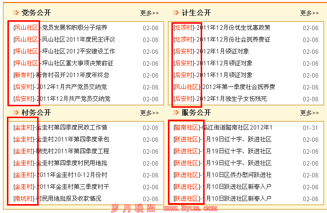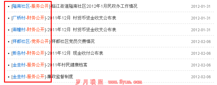 这种列表页形式对于门户网站来说,非常的适用。以上面的截图来说它非常清晰的告诉读者是哪个村的哪个公开。这不仅对户来说是个好消息,同时对搜索引擎来说也是如此。因为这个网站是刚改版不久,而它的前身就是缺乏红框圈起来的这块,对于当时的我们来说,列表页就是可有可无的页面,而如今进入列表页的访客也明显增多了不少。