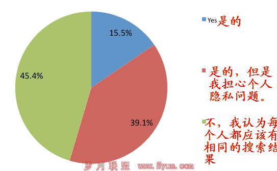 我们可以看出对这一问题持肯定态度的只有少数。但是很明显的我们可以看出,持矛盾或者不喜欢这一搜索结果的占到了绝大多数(84.5%),其中有45%的受访者表示他们并不希望所有的搜索结果都是个性化的。所以持否定态度的人占到了主导地位。