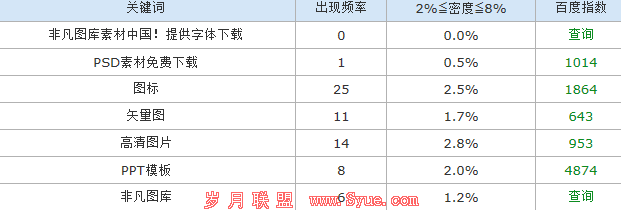 看了下网站的大致信息,收录将近2000,外链1000多,快照隔天,感觉还行,这网站有点发展前途,有底子,可以接下了。但用站长工具查的时候我发现一个挺有意思的问题,他的TITLE是:非凡图库素材中国-素材,素材天下,图片素材,中国素材,图标素材,PPT素材,矢量素材-非凡图库,但在下面的关键词框那栏,却显示的不是这些词,显示的都是一些栏目的名称,不大像主要关键词,我给你们截个图。