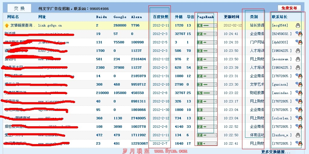 找好资源就是要学会分析研究,充分的加以利用的。首先要考虑的是你在上面想要了解什么。在go9go平台上,我们可以最直观的看到一些数据,百度快照,排名,类别,站长的联系方式。这也就是我们在进行友链时必须考虑的因素。从优化的角度来分析,我们在进行连接交换的同时最好是同行业之间的相互推荐看一下我标红的几栏,其中一栏就是类别,主要有人才培训,门户网站,企业商务,娱乐休闲等等。