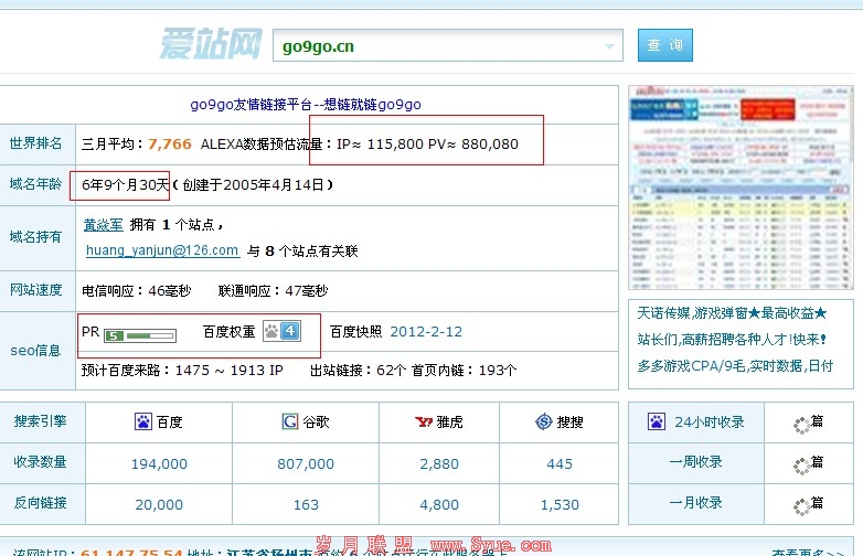 友链平台的选择需要考虑的因素以实图讲解,主要关注一下如图所标红的部分:域名年龄越长,权重越高,知名度越大。还有首先显示的是ALEXA数据流量,如此庞大的IP与PV,可以看出像GO9GO这样的平台确实可以给我们这些寻找外链,寻找同盟,友链的新手站长提供了很好的条件。这几点也正是我们新手站长所要寻找友链平台所要考虑的几项因素。