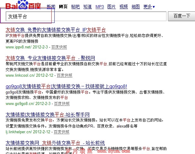 寻找友链平台,一方面要靠自己去寻找,去积累。另一方面也要通过名师益友的指点或推荐。最直接的方法,在百度上直接输入“友链平台”四个字如下图。不过这样搜索出来的结果需要我们自己去删选和分析。毕竟新手一下子说学会分析,学会总结也不是那么容易,这就要我们自己学会取经。多多跟圈内的朋友沟通,交流。
