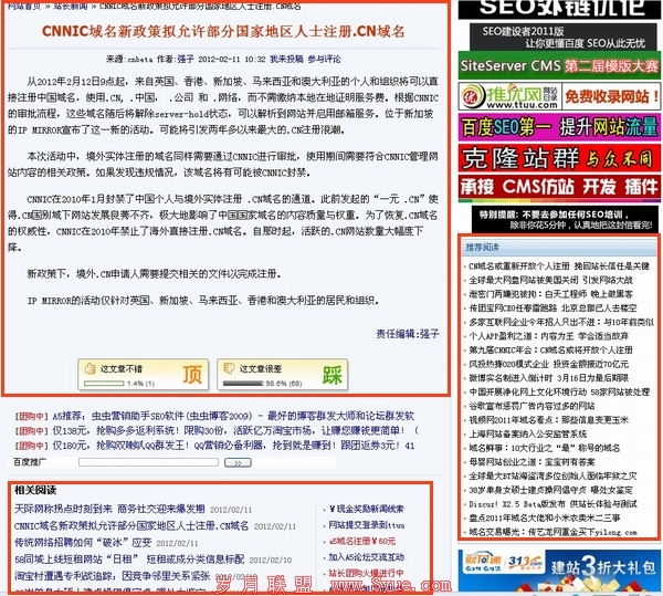 网站我们可以通俗的切成三个部分,即分别为头部、主体以及底部。根据访客的浏览习惯,中央的主体部份我们一般是分为左右两边,左边的话放置内容,右边则放置一些相关的超链接,如A5站长网,下图所示。那么笔者将主要分享站点的主题位置的內链的优化。