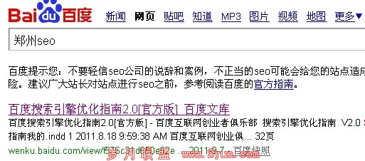 今天2012年2月15日,郑州地区没有风和日丽,心情犹如这天气一样,为了一个关键词的排名,头疼死了,一直在思考遇到的种种问题,这时一兄弟发来信息:快去百度搜索SEO,我就试着去百度搜了下seo,结果如图: