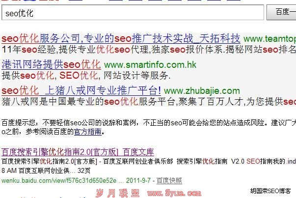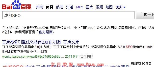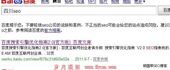 搜索关于SEO的词语,如“成都SEO”、“四川SEO”,"北京SEO"等各城市SEO,均出现了一些提示:“百度提示您:不要轻信seo公司的说辞和案例,不正当的seo可能会给您的站点造成风险。建议广大站长对站点进行seo之前,参考阅读百度的官方指南。”及接下来的第二位是百度文库“百度搜索引擎优化指南2.0[官方版]”页面。要说百度给予自己的文库权重高,也不至于在短时间内就都上升到各个城市SEO排名之前了。百度为什么要这么做霸占城市SEO关键词排名首位呢?