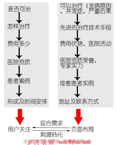 首先我们要明确一点,医疗行业的着陆页目的是要让用户来院到诊,退而求其次的是产生对话咨询。那么就要明确我们的着陆页应该有哪些要素?我们的目的非常简单直接,就是要刺激有潜在需求的用户实现转化,那么用户关心的是什么?第一、这个疾病是否可治(或者需要多长时间痊愈);第二、怎么治疗(通过什么技术手段可以治愈);第三、费用多少;第四、医院的资质;第五、该医院是否有治愈的先例;第六、距离行程或时间安排。笔者在这里要特别强调的是,这六点的顺序,是以最关心到最不关心的方式排列的。一个用户(潜在患者)在医疗行业的竞价着陆页中最关心的一定是这个病能不能治愈(当然,现在几乎没有什么病是不可治的了),治疗的费用都放在的次要考虑的位置,这也是医疗行业的Landing Page的特殊之处。