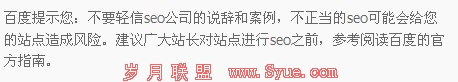 第一句话“百度提示您,不要轻信SEO公司的说辞和案例”,我们可以看出: