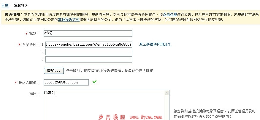 最后注意的是,在申请投诉的时候,一定要填写真实的原因,因为投诉都是人工审核的。随便写一个,人家是不会给予通过的。其实还有其它的方法,不能依赖于百度快照投诉,如果你的网站快照出现了问题,要做的是找出问题,再解决问题。那么原因该怎么去分析:首先要分析在以往两周自己坐了什么,为什么会导致快照被删,或被替代,找到问题,然后再去解决;切记不要经常修改标题。
