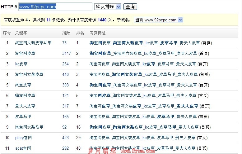 大家可以看出建站时间没超过三个月,去年年底上的,一个月的时间百度权重到4,主关键词是淘宝网皮草,指数当时是3000左右,排名第一,由于站长工具缓存的原因上图显示为二,日IP1000左右。
