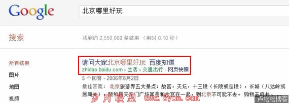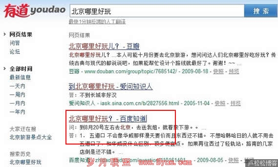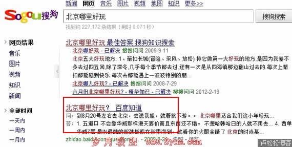 尽管通过soso搜“北京哪里好玩”百度知道网址并没有进入前三,但也排在第六位。由于篇幅所限,卢松松就不截图了,有兴趣的朋友可以用各大搜索引擎搜下。在中国互联网上,大部分用户偏重娱乐。所以我选择了“北京哪里好玩”这个词组。尽管这不是热门关键词,但通过百度指数发现这么长的词组每天也是有不少人搜索的。