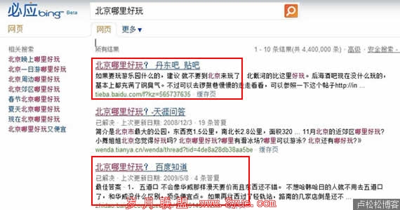 反过来,当我试着在百度搜索“北京哪里好玩”、“网站运营”这两个词组时,除了搜索问问拍在第二页之外,没有发现其他搜索引擎自家产品的影子。除了bing之外,Google、搜狗、有道都有问答、百科之类的产品。可以看出,百度针对其他搜索引擎做的SEO优化非常强悍,无论用户怎么搜索,搜来搜去,结果都跑到百度上了。我想这也是谷歌退出中国后,为什么搜狗、搜搜和有道的市场份额变化不大,只有百度蚕食了大部分份额的原因之一吧。