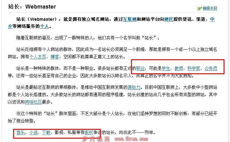 笔者个人对百度站内链接的做法是非常的喜爱,至少笔者在看百度百科的时候觉得非常的便捷。百度百科的站内链接就像一座桥梁,连接着一个个相关的页面,显得把一个个零散的词条融合成了一个整体。拿下图这个例子来说,笔者在浏览站长这个词条的时候,如果对公务员不是很了解,可以直接点击公务员这个链接,跳转到了公务员词条,这在很大程度上缩减了笔者浏览的时间。所以笔者个人觉得,一个好的站点应该要有这样的站内锚文本链接,使得网站的连通性更强。