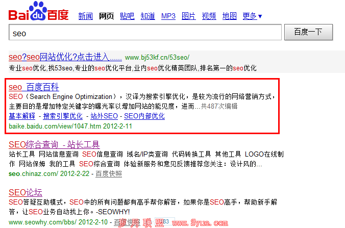 不得不说,我更愿意去点击百度百科来了解到底什么是SEO。大多数人不服气SEO百度百科排名在SEO论坛前面,然而却是没有考虑搜索SEO这个词的人更想详细了解SEO,而SEO百度百科这个词条显然更符合用户体验。百度百科的排名效果不仅在百度上表现出色,也在google上表现非常不错,这也体现出了百度百科确实在SEO优化方面做得非常的出色。那么我们就来学学这位SEO大师的教导吧: