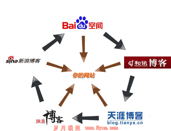 首先我们说说使用博客群的方式。博客群刚开始我们不要用刚刚注册的,这样的博客实际上作用并不大,我们应该尽量使用注册时间相对较长的,有一定收录的博客。博客首选,百度空间和新浪和网易的。然后进行博客的链轮,需要注意的是要循序渐进,不能一下子就链完所有的博客,互链之后,我们就可以通过文章的发表进行权重的提升,具体如下图所示。