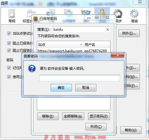 如图:需要显示密码需要输入主密码,当查看已保存的密码也需要输入主密码。