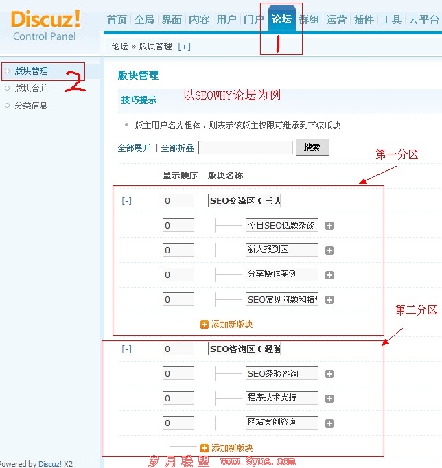 按图中添加好相应的版块,后点击提交。然后我们到首页预览,并对照下SEOWHY论坛。图如下: