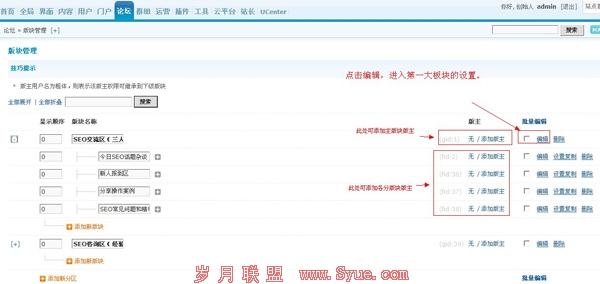 通过对比,这两个大板块的添加成功,但是可以看到,SEOWHY论坛子版块都是横向显示的,看起来也美观。每行显示3个,那么如何设置呢?我们以第一个大板块“SEO交流区(三人行必有我师)”为例,点击图中的编辑版块,如图: