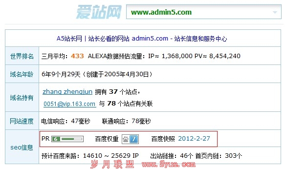 主关键词、二级关键词,我们一般都是用网站首页或者频道页来承载的。对于这类词,一般都是一些行业词且搜索量很大同时竞争也是相当激烈的,我们应该找一些 高质量的友情链接来导入。我们在判断友情链接的质量时,一般可以从PR值、快照、网站收录量、导出链接数等。另外还可以参考一下对方的百度权重值,现在很 多工具都加入了这个查询的功能(比如:爱站网等),如下图所示: