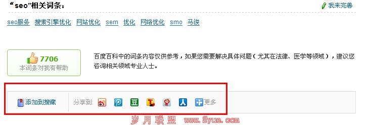 在过去的2011年中,我们可以发现搜索引擎对于社交网络的重视,在Google推出其社交网站Google+后也宣布将社会信号纳入排名的因素之一,同时百度也推出了自己的百度分享社交网络共享按钮。足见为了搜索引擎对于社交网络的重视。这点我们也可以在百度百科上看到呈现。我们可以在百科每一个词条的末尾处发现社交网络的共享按钮,你只要点击一下就可以将该词条的内容分享到你自己的社交网络上去。
