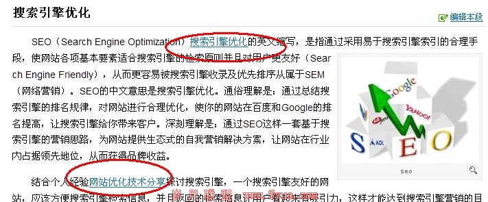 我们可以发现百度百科上的另一个明显的特色就是一个完美的内部连接结构,在百科词条中几乎所有的相关的词条之间都有通过内部的锚文本进行相互的链接。我们同样以“seo”这个词条为例,我们可以发现在一个词条之中就至少有三四十个内部的锚文本链接。而这一些站内的锚文本是提高用户友好体验及增加搜索引擎蜘蛛爬行深度的关键技巧,而且如果可以合理的通过这种方式进行内链的构建还可以使读者在我们的站点停留更长的时间,读者将会有一个更加深入的访问。