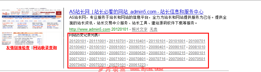 上图展示了A5站点的域名由2006年开始,一直处于站长型站点,从未变更过。这样的坚持运作是我们站长必须要学习的精神。而且从现在优化角度来看,A5的前期工作做得非常的足够。这点可以从他们关键词的设置,站点title的抒写以及域名的选取之中就可以看出。