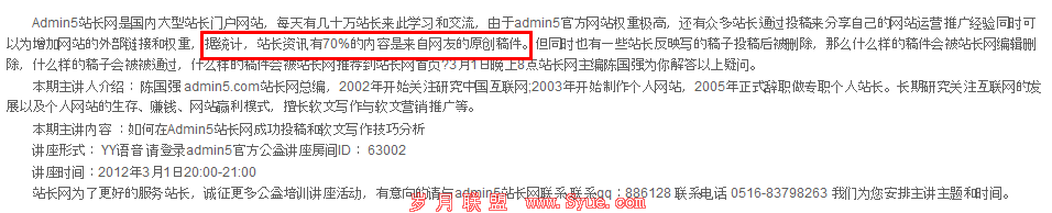 当站长朋友们看到这样的统计的时候是不是非常的羡慕,每天网站都有别人帮忙注入新鲜的原创内容。而且还有专业人员审核,保证其文章的质量。在这个情况下,我们只能说,A5辛勤的劳动的硕果非常的大。所以我们通过研究A5站点,试试看它的成功可不可以复制,作为站长的我们应该要勇于尝试。本文由捷易通http://www.jieyitonggo.com原创,转载务必注明出处。