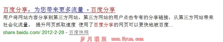 第二:即使百度分享结果不出现在搜索结果中,但通过百度分享按钮,您的网站的浏览者可以便捷得分享您网站上的内容到人人网、开心网、qq空间、新浪微博等SNS站点进行传播,为您的网站带回更多的流量。还可以通过百度分享按钮,您网站上的网页将更容易被百度搜索引擎所发现,从而有机会从百度搜索带回更多的流量。再有通过百度分享按钮,您可以免费获取详尽地分享统计分析。了解网民将您网站上哪些内容分享到哪些SNS网站,每日的分享次数是多少,帮您更好得的跟踪、分析、激励用户的分享行为,为网站带来更多的流量。