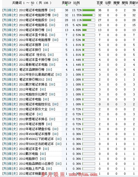 比如本人小站,围绕“笔记本电脑”这个关键词,就可以用“2012笔记本电脑推荐,2012笔记本电脑排行榜,2012笔记本电脑排名”等关键词;其相关的长尾关键词还有很多,可谓源源不断!(见附图本站今日的关键词流量和排名图)。也许各位看官已经注意到,这些关键词基本上都包含“2012”一词,这也是关键所在,这样既保证了网站主题关键词的整体性、时效性和相关性,提高用户体验,同时有利于网站SEO优化,增加关键词的权重和排名。笔者一直使用该技巧,屡试不爽,获得不少相对集中的有效关键词。相信其实多数站长朋友都在使用这个方法,但能真正体会其精髓的并不多,这需要时间慢慢实践和不断测试,也就是所谓相关搜索法。