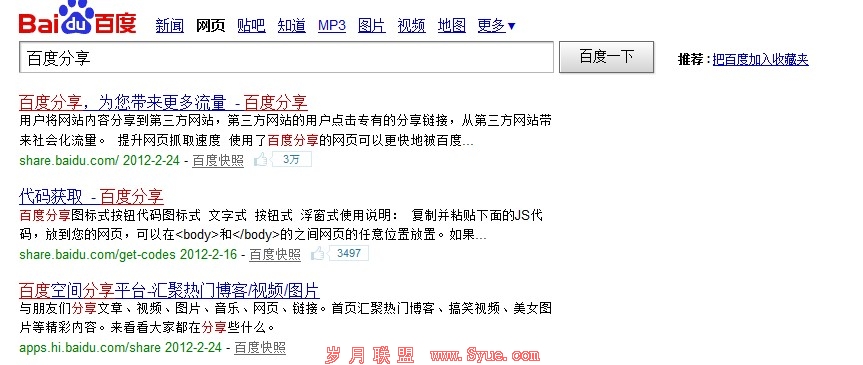 2、搜索引擎现在没有官方的说明整个百度分享所能够给予搜索引擎排名带来的帮助,但是用户关注的网站都是优秀的,从这一点,用户每搜索一个关键词都会发现在搜索引擎结果中百度快照边上的“大拇指”数量信息,也提前告知了用户,该平台有多少“大拇指”鼓励推荐,例如:排名第一的网站只有5个大拇指推荐,但是排名第三的网站有超过200个,那么这个时候你的眼光会马上放在第一和第三,但是如果处于现目前习惯的情况下会选择1和3,如果未来形成了发展趋势我相信大家都会直接选择3,这个就是针对用户体验所调整。