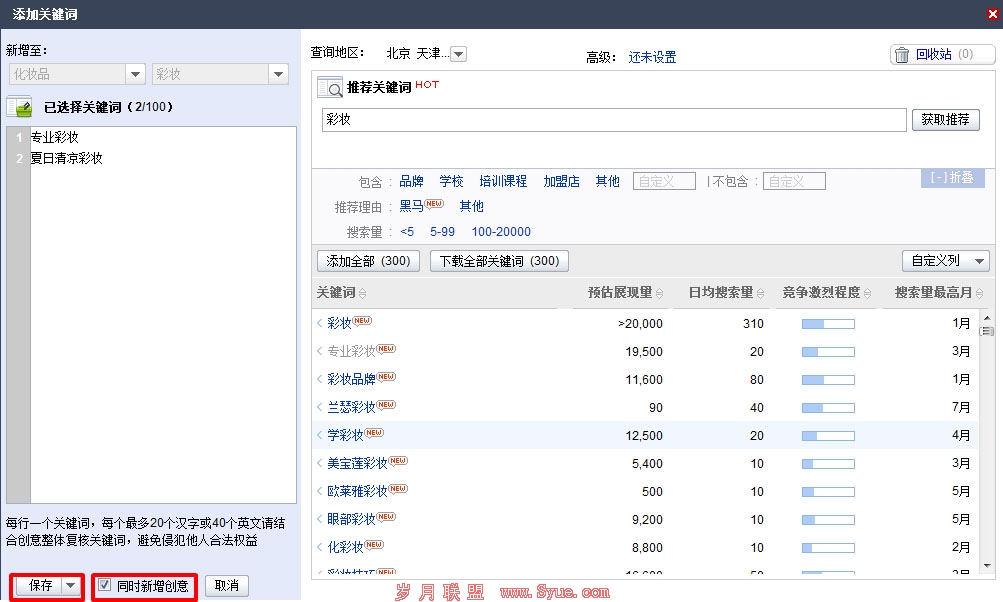 第四步,出现添加关键词的窗口后,徐老板可以手动输入关键词,如“专业彩妆”,也可以通过右侧的关键词推荐来获得系统推荐的关键词,添加好关键词后,选择“同时新增创意”,并点击“保存”,进入新增创意窗口: