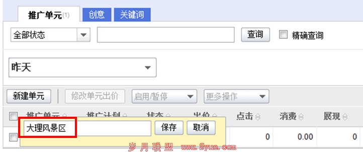 在经过几天实地考察和精心思索后,王女士决定在大理进行大理风景区的项目投入。于是她将“云南旅游”推广计划中的“大理特色”推广单元调整为“大理风景区”(点击需要修改的推广单元中的