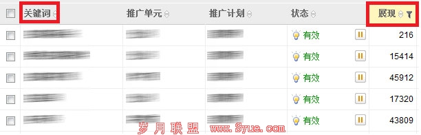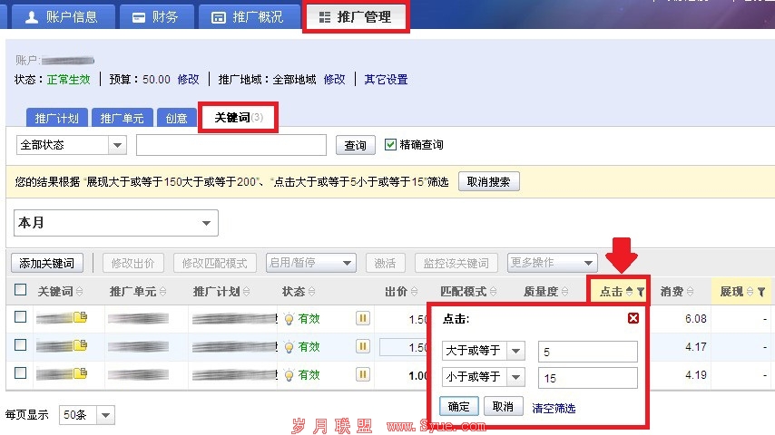 案例二:交叉筛选,助您迅速查找物料 旅游行业的张老板进行推广以来效果虽然持续上升,但还是有几个关键词稍稍影响着整体的状况。于是,张老板列出了一个“点击”、“展现”的范围,想要找到这个区间范围内的关键词进行调整。其中,有一个问题困扰着张老板,面对数以千计的信息,他不知道怎样找到这个范围内的关键词。带着疑惑,他打电话咨询了我们的客服人员。在客服的悉心指导下,他找到了解决办法: 第一步:在推广管理下选择关键词层级,然后分别点“展现”和“点击”旁的筛选标签按钮