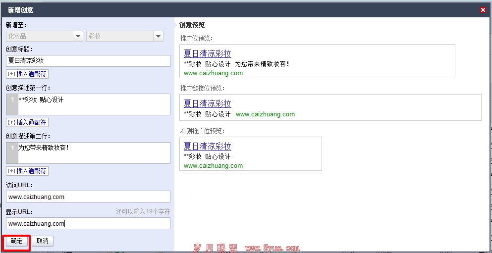 第五步,徐老板在“新增创意”窗口中,根据添加的关键词进行创意的编辑,完成后点击“确定”,一套完整的推广方案就这样完成了!