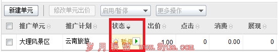 在投放了一段时间后,王女士觉得大理风景区带来的推广效果并不是很满意。于是,她暂停了整个单元,决定对推广方案进行优化后,再继续推广该方案。从选择了暂停推广开始,账户树会提示您该单元处于暂停的状态(左侧会出现一个圆点):