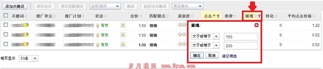 第二步:筛选好“点击”范围后,再对需要查看的“展现”范围进行设定: