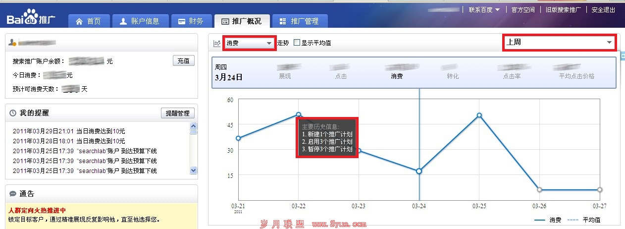 案例一: 从信息查看纵览全局——推广概况页,集成历史趋势 从上周开始,李先生的公司推出一款新的夏季促销活动来吸引消费者眼球。这次促销活动已经推广两周了,李先生最关心的就是这款促销活动的推广效果。于是,李先生几乎每天都去账户中观察一下消费、点击的变化趋势,以及分析引起这些变化的原因。通过简单的3步,在短短几秒钟时间里,李先生就能轻松查看历史信息,定位原因: 第一步,打开推广概况页,选择消费或点击选项,定位一个希望查看的时间区间。这时,历史趋势图出现在概况页右侧区域: