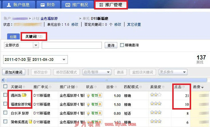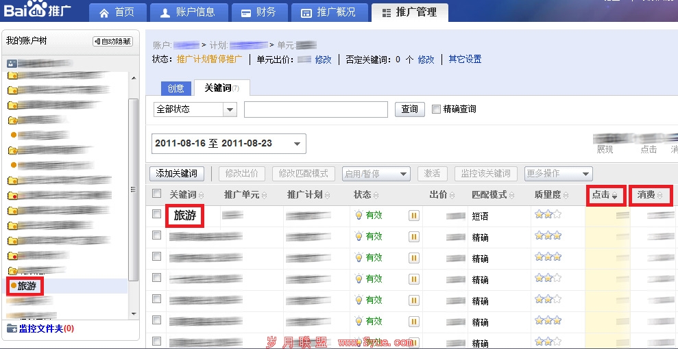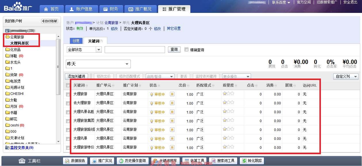 接下来,她王女士开始考虑第二个问题,如何关注投放后的推广情况和反馈状态? 首先,在推广管理页面下,通过页面左侧的账户树选择需要查看的推广计划。这时,该计划下拉出包含的所有单元,即点击“云南旅游”推广计划下的“大理风景区”单元,右侧就会出现该单元下所有的关键词。这时,王女士就能快速定位查看所需的关键词了。